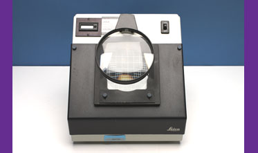 Illumination is provided by 40W tungsten bulbs. The 113mm lens offers 1.5x magnification and is positioned to eliminate parallax errors. Focus lens by sliding rod; swing away when not in use. Second optional lens may be attached to increase magnification to 3x. Sheet metal case is finished in contrasting gray-beige acrylic enamel and black suede.
